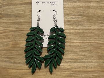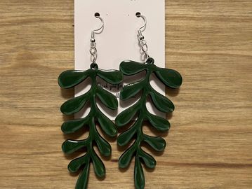 A set of intricate green leaf-shaped dangle earrings. The earrings are designed to resemble cascading foliage and features a smooth resin finish.